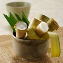 3. Tata contong janur di atas ampas kelapa. Tuang bahan I sampai 3/4 tinggi contong. Kukus 10 menit dengan api sedang.