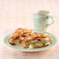 - Ambil croissant. Belah tidak putus. Oleskan bahan olesan. Beri lettuce, tomat ceri, ayam, dan bawang bombay. Sajikan.