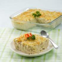 - Tuang di atas skotel. Tabur keju parut. Oven 25 menit dengan api bawah suhu 170 derajat Celsius sampai matang.