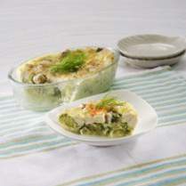 - Tata brokoli di pinggan tahan panas yang dioles tipis margarin. Tabur dengan tahu dan ikan.