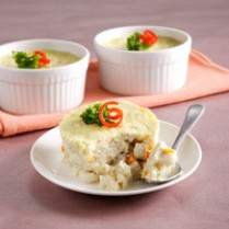 - Tuang di pinggan tahan panas kecil bulat diameter bawah 6 1/2 cm, diameter atas 8 cm, dan tinggi 4 cm yang dioles tipis margarin.
